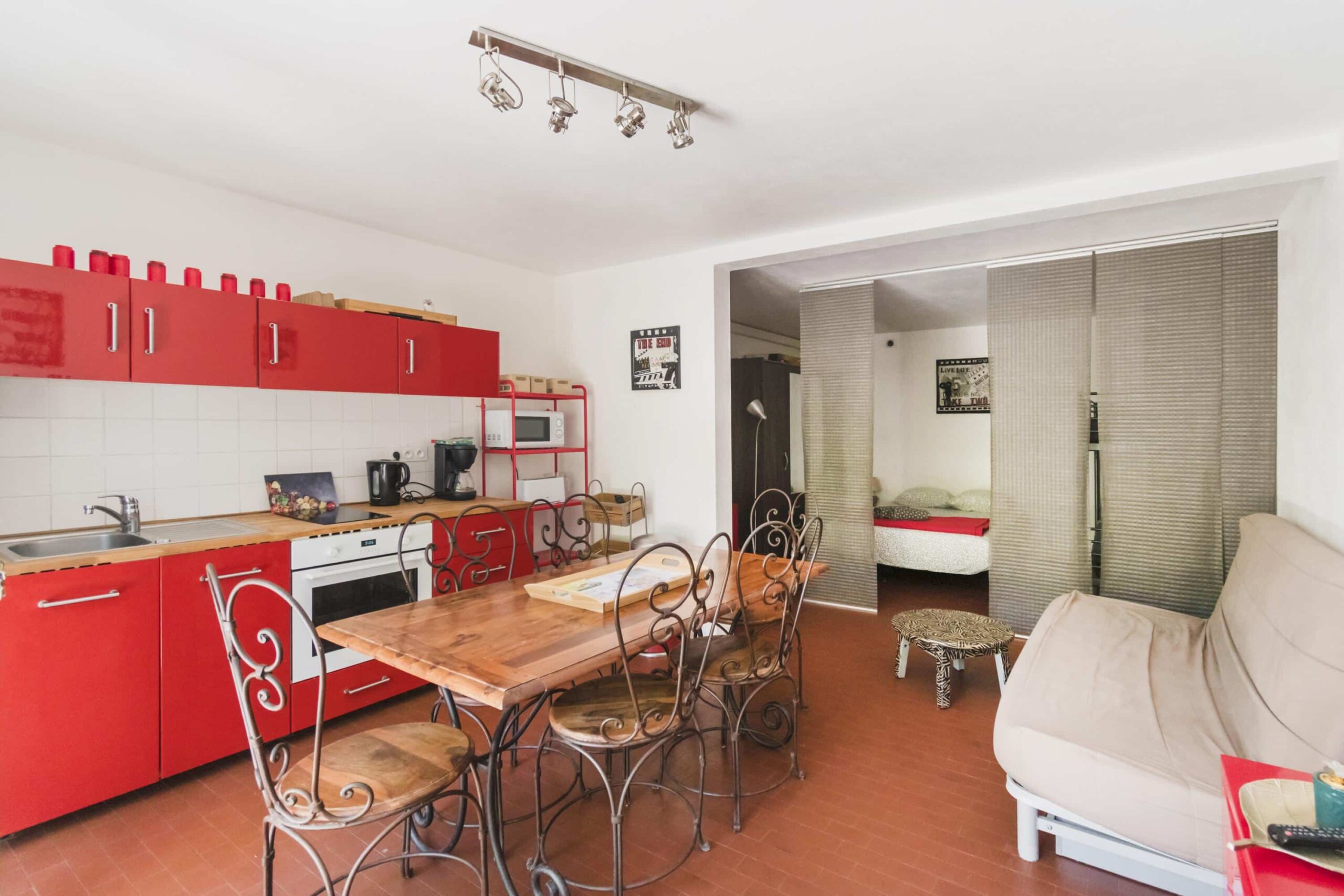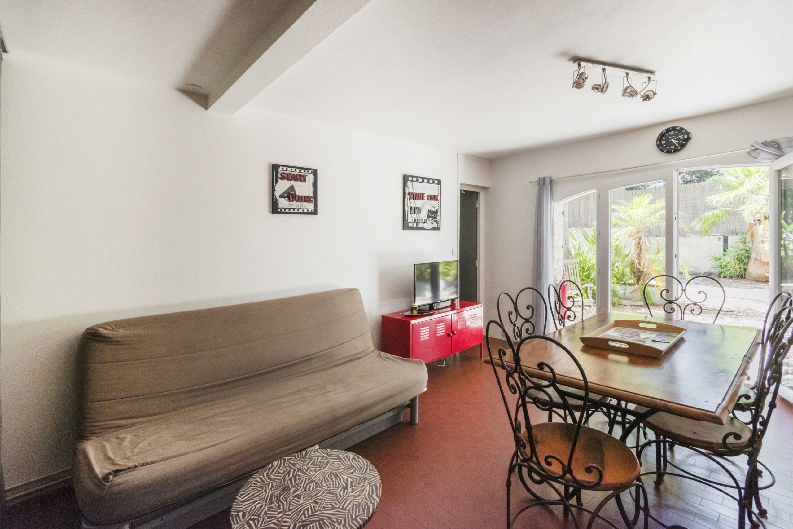 - Salon avec canapé convertible à lattes, table basse et TV écran plat